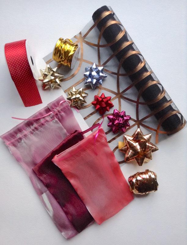 Набор для упаковки и декора подарков Бантики, ленты, органза, подарочные мешочки Бантики 6 шт, на липучке Органза - 29 см х 3 м Золотая проволока - 12 м Красная лента в горошек - осталось 82 см Пакеты на фоне листа А4 для сравнения