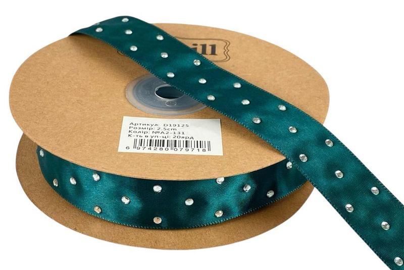 Атласная лента 2,5см х 18м со стразами темно-зеленая (d19125-a2-131)