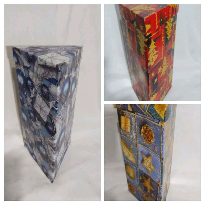 Тип упаковки: Коробки Кілька примірників у наявності Коробочка для подарунка виконана з щільного картону, складається з двох частин, нижній та верхній. Коробка має трикутну форму. Матеріал : картон, кольоровий папір пакувальна. Розміри коробочки : Сторони: 15 см. Висота: 30 см.. Номер наданої моделі коробки - N 805. Ціна за 1 штуку.