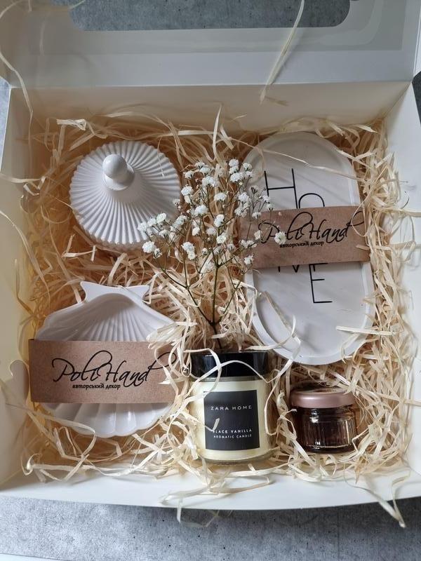 Подарунковий бокс( гыпсовий декор + доповнення сычки або солодощі) Гіпсова підставки та шкатулка виготовлена з якісного гіпсу та оброблена вологовідштовхуючим просоченням. Може використовуватись у ванній кімнаті, як піставка під креми та косметику. Ідеально підходить для свічок та біжутерії Вартість подарункового бокаса 550-700 гривень в залежності від комплектації Товар под заказ