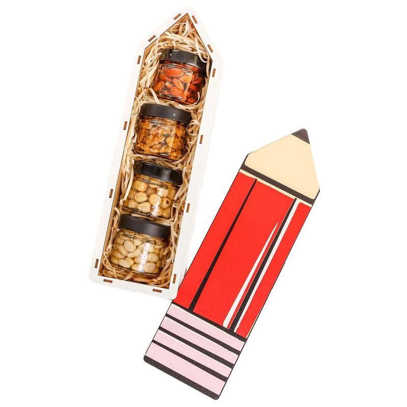 Подарочный набор для учителя в деревянной коробочке размером 33*10 см. Очень хорошее качество. На крышку нанесено цветное ламинирование, которое прекрасно передает цвета. В составе набора со стеклянными баночками с орехами и медом: 130 г арахис 130 г фундук 130 г миндаль 130 г грецкий орех. Этот набор отлично подойдет именно для мужчины учителя. Для женщин учителей мы можем предложить Вам такой же набор, но с кремированным медом, с разными вкусами. Этот набор может быть отличным подарком для учителя на разные праздники. Такие как День знаний, День учителя, также 8 марта, или Новый год. Дополнительные характеристики: Материал : Дерево