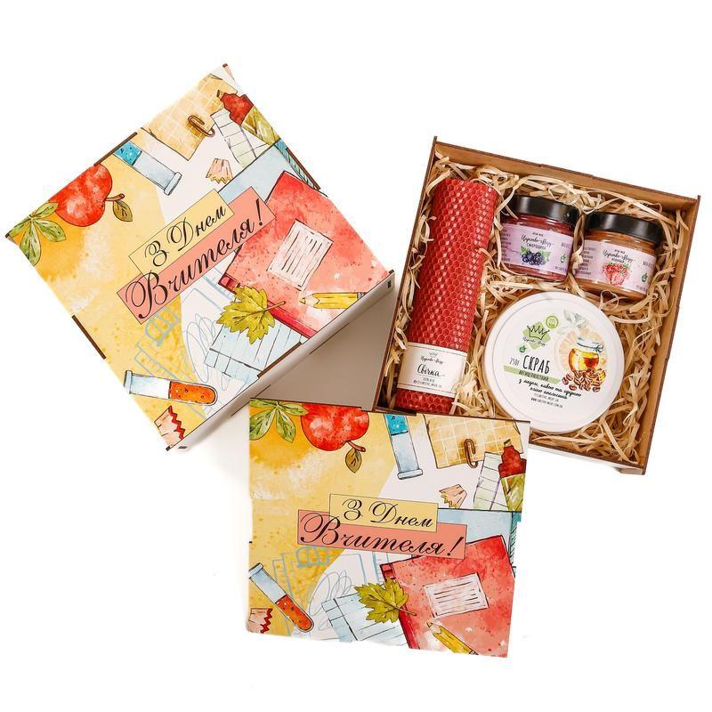 Подарочный набор для учителя на День Учителя, или 1 сентября в деревянной коробочке размером 20*20*7 см. Послужит для Вас отличным подарком от родителей Вашему классному руководителю., или первой учительнице. Наполнение данного набора: - 17.5 см свеча восковая - медовый скраб для тела - 130 г крем мёд смородина - 130 г крем мёд клубника Наполнением такого набора может быть мёд в разных баночках. Вся продукция представленная на фото изготовлена на семейной пасеке Царство Меду. И является натуральным продуктом.