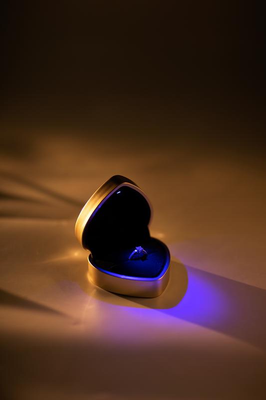 Коробочка для каблучки пропозиція у вигляді серця Розміри: ширина 6,5 см довжина 7,2 см висота 4,5 см Колір: золотистий Колір підсвітки: синій Покриття: глянцеве Матеріал: пластик