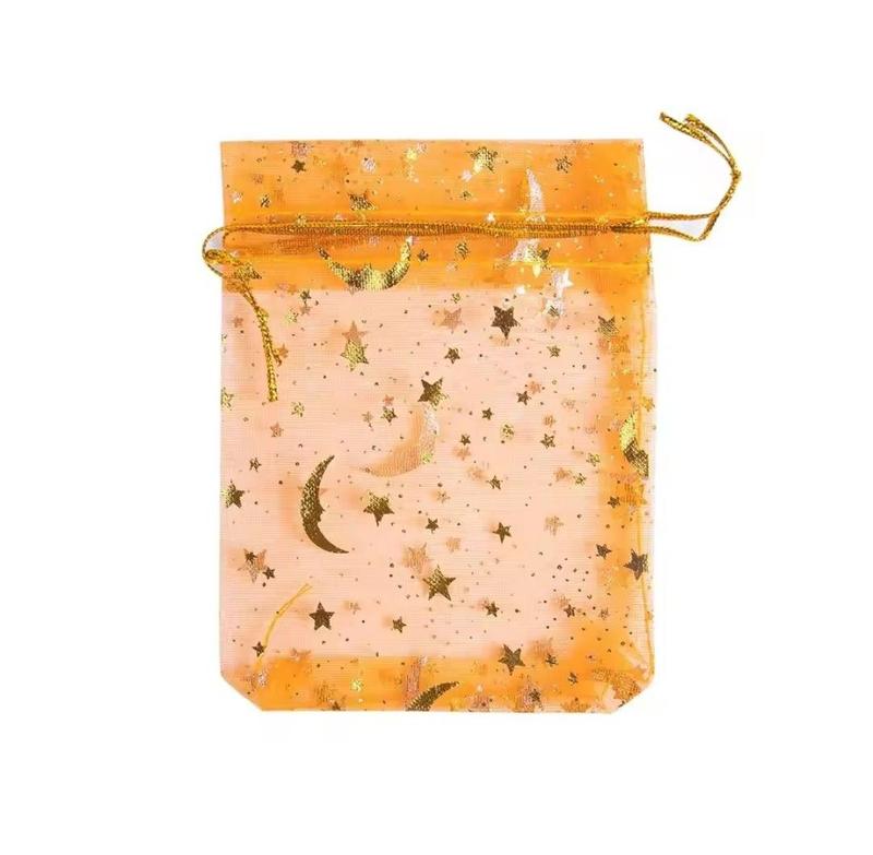 Роскошные стильные мешочки из тончайшей органзы, широкий выбор цветовой палитры. Затягивается мешочек тонким шнуром. Состояние - Новое Страна производитель - Китай Материал - Органза Размер - 120 х 90 мм Цвет - оранжевый со звездами и месяцем
