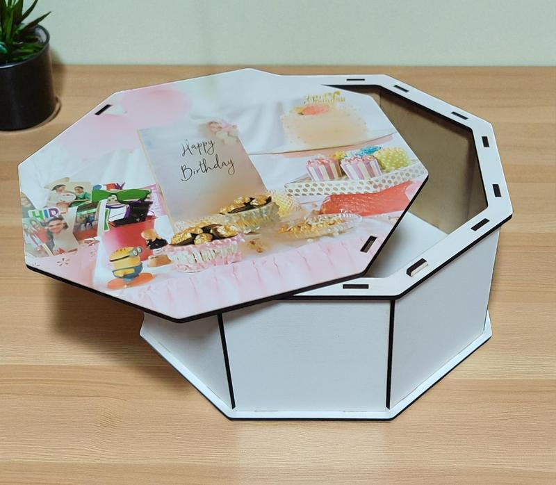 Коробка подарочная восьмигранная 180x180x83 мм с днем рождения