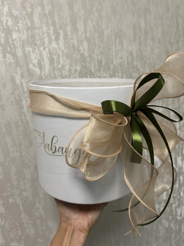 Стан на фото, дефекти на дні. Цупка якісна коробка, бантик за потреби знімається. Заміри на фото