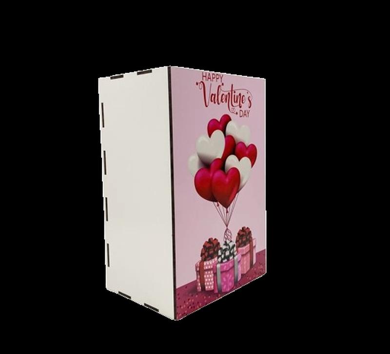 Подарочная коробка прямоугольная Happy Valentine's day сердца с подарками Деревянная коробка предназначена для оформления оригинального подарка, композиции из фруктов, овощей, мыла, сладостей. Изготовлен из высококачественного экологичного материала, ДВП толщиной 3 мм, поэтому долго будет сохранять свой безупречный вид. С ее помощью можно создать невероятный красивый презент на день Святого Валентина. 23Х15 см, высота 11см