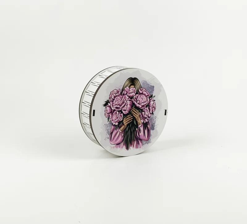 Подарочная коробка круглая "Девушка - пионы" 3. Деревянная коробка предназначена для оформления оригинального подарка, составления букета или композиции из фруктов, овощей, мыла, сладостей. Изготовлен из высококачественного экологичного материала, ДВП толщиной 3 мм, поэтому долго будет сохранять свой безупречный вид. Композиции в таких коробках, непременно порадуют как взрослых так и детей.