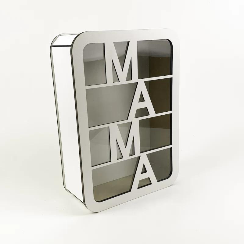 Подарункова коробка з прозорою кришкою "Мама" прямокутна біла. Дерев'яна коробка призначена для оформлення оригінального подарунка, складання букета або композиції з фруктів, овочів, мила,солодощів. Виготовлено з високоякісного екологічного матеріалу, ДВП товщиною 3 мм,тому довго буде зберігати свій бездоганний вигляд. Композиції в таких коробках ,неодмінно порадують як дорослих так і дітей.