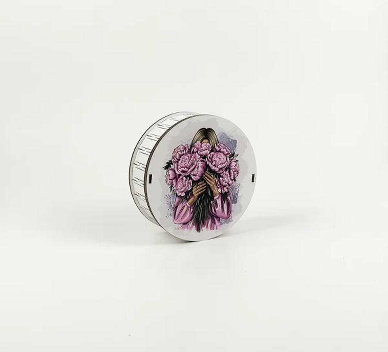 Подарункова коробка кругла "Дівчина - піони" 2. Дерев'яна коробка призначена для оформлення оригінального подарунка, складання букета або композиції з фруктів, овочів, мила,солодощів. Виготовлено з високоякісного екологічного матеріалу, ДВП товщиною 3 мм,тому довго буде зберігати свій бездоганний вигляд. Композиції в таких коробках ,неодмінно порадують як дорослих так і дітей.