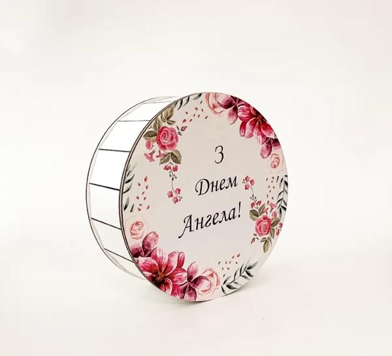 Подарочная коробка круглая "С Днем Ангела!" Деревянная коробка предназначена для оформления оригинального подарка, составления букета или композиции из фруктов, овощей, мыла, сладостей. Изготовлен из высококачественного экологичного материала, ДВП толщиной 3 мм, поэтому долго будет сохранять свой безупречный вид.