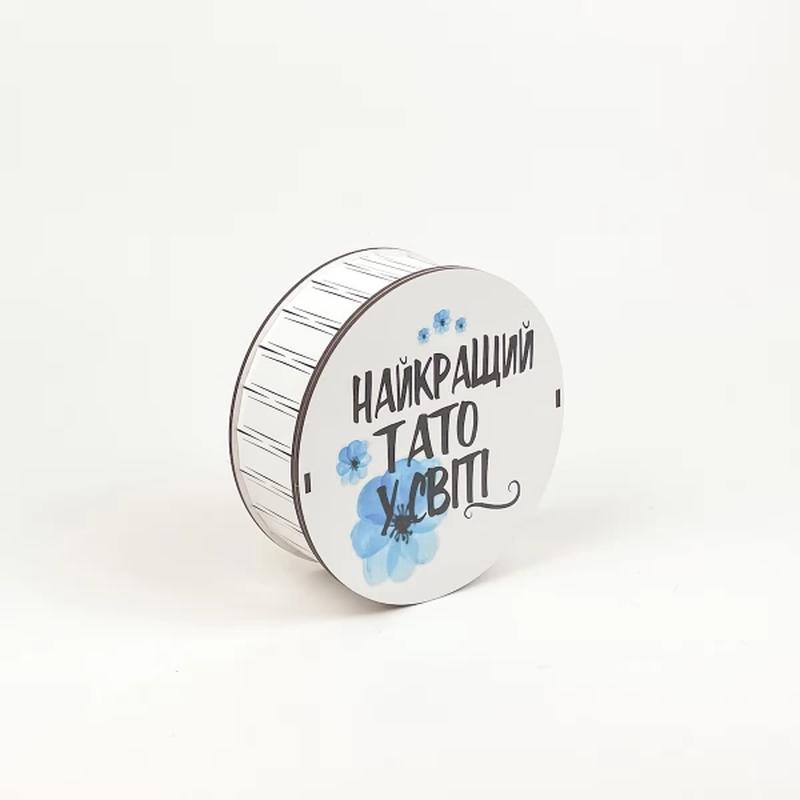 Подарочная коробка круглая "Лучший папа в мире" 2 Деревянная коробка предназначена для оформления оригинального подарка, составления букета или композиции из фруктов, овощей, мыла, сладостей. Изготовлен из высококачественного экологичного материала, ДВП толщиной 3 мм, поэтому долго будет сохранять свой безупречный вид. Композиции в таких коробках