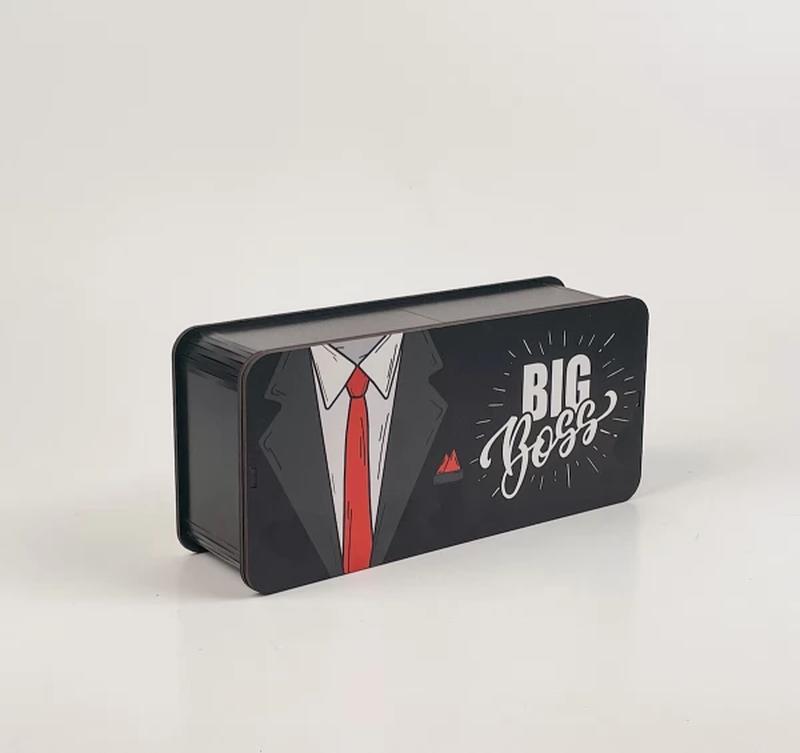 Подарочная коробка прямоугольная черная "BIG Boss" 3 Деревянная коробка предназначена для оформления оригинального подарка, составления букета или композиции из фруктов, овощей, мыла, сладостей. Изготовлен из высококачественного экологичного материала, ДВП толщиной 3 мм, поэтому долго будет сохранять свой безупречный вид. Композиции в таких коробках, непременно порадуют как взрослых так и детей Размер 3-26Х12 см. глубина 7 см.