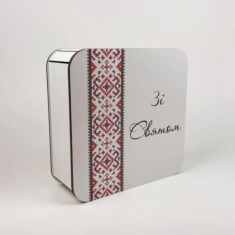Подарочная коробка квадратная "С Праздником" Вышиванка Деревянная коробка предназначена для оформления оригинального подарка, составления букета или композиции из фруктов, овощей, мыла, сладостей. Изготовлен из высококачественного экологичного материала, ДВП толщиной 3 мм, поэтому долго будет сохранять свой безупречный вид. Композиции в таких коробках, непременно порадуют как взрослых так и детей