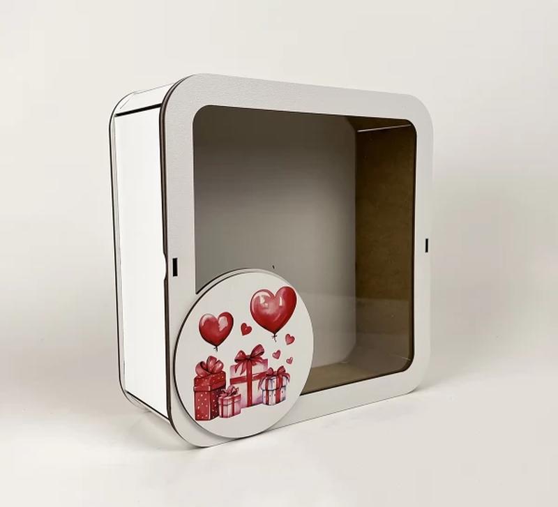Подарочная коробка квадратная с прозрачной крышкой "Шарики с подарками" Деревянная коробка предназначена для оформления оригинального подарка, составления букета или композиции из фруктов, овощей, мыла, сладостей. Изготовлен из высококачественного экологичного материала, ДВП толщиной 3 мм, поэтому долго будет сохранять свой безупречный вид. Композиции в таких коробках, непременно порадуют как взрослых так и детей