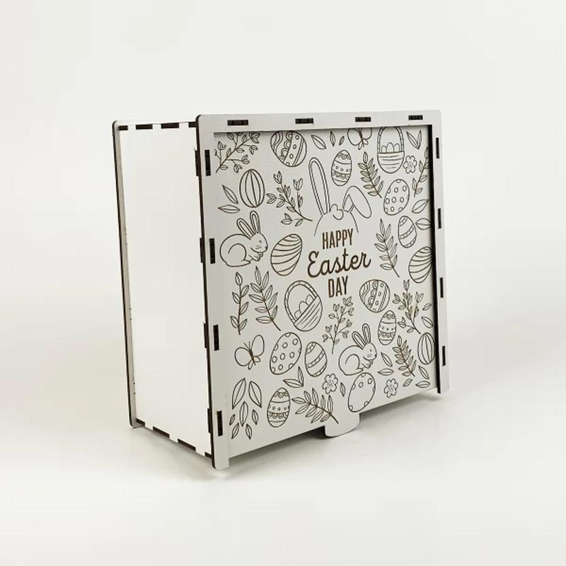 Подарочная коробка белая квадратная на засов "Happy Easter Day" Деревянная коробка предназначена для оформления оригинального подарка, композиции из фруктов, овощей, мыла, сладостей. Изготовлен из высококачественного экологичного материала, ДВП толщиной 3 мм, поэтому долго будет сохранять свой безупречный вид. С ее помощью можно создать невероятный красивый презент, день рождения
