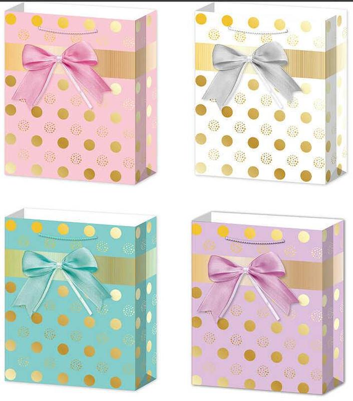 Стильный подарочный пакет C 75731 Большой подарочный пакет украшен золотистыми точками и разноцветными бантами. Отлично подходит для упаковки подарков на любые праздники. Пакет оснащен удобными ручками для переноски. - Размер: 31.5х12.5х40 см - Четыре варианта дизайна в одном наборе - Яркие цвета с золотыми деталями - Прочный материал для многократного использования