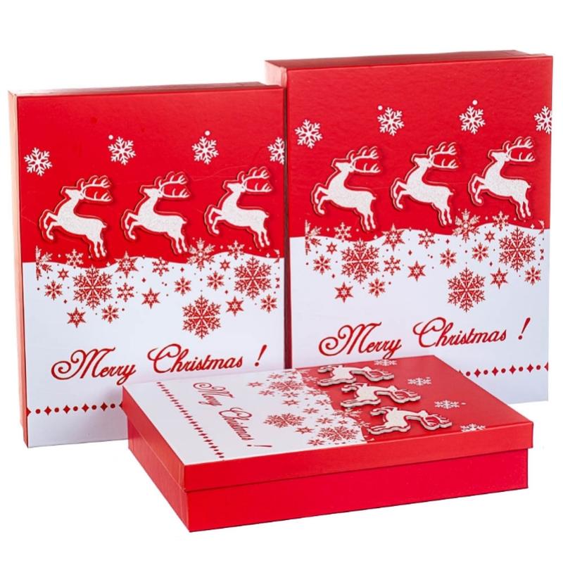 Набор из трех подарочных коробок незаменимый помощник для упаковки новогоднего подарка. Благодаря своему универсальному дизайну, в таких коробках можно презентовать сувениры для бабушек и дедушек, сестер и братьев, подруг и коллег. Интересный принт придает коробке индивидуальность и еще больше погружает в новогоднюю сказку, которая, несомненно запомнится Вашим близким. Коробки практичны, Они станут 100% топовым товаром ваших продаж либо украшением магазина. Ширина, см30 Длинна, см39 Высота, см11 Упаковка, шт16 Материал Картон