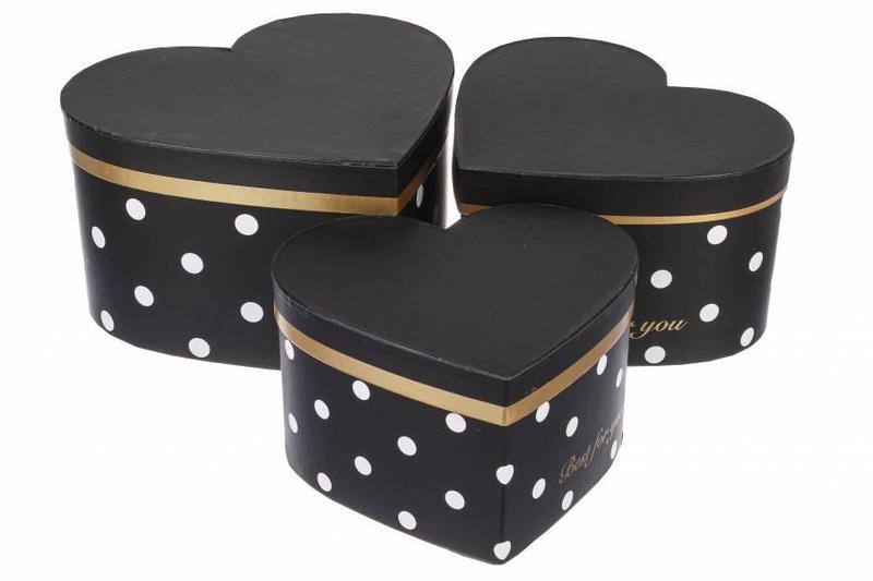 Набор подарочных коробок в форме сердца черных с белым горошком, разм. l:27х24х15,3 см (ко...