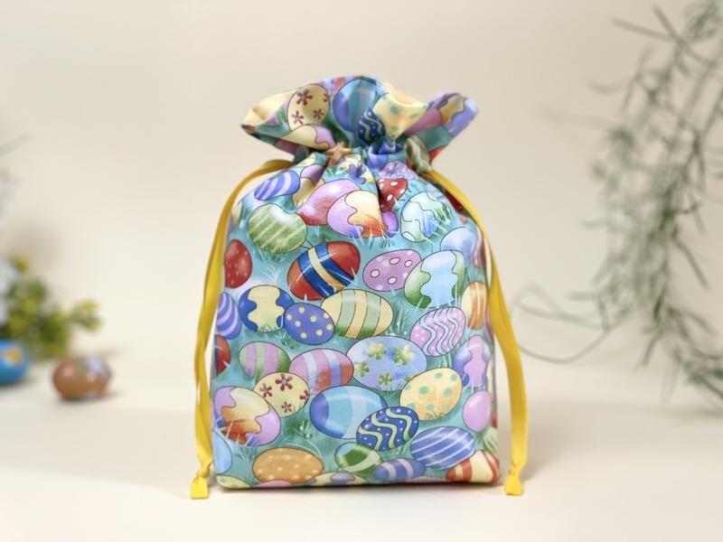 Эко мешочек изготовлен из американского премиум хлопка, с принтом красочных пасхальных яиц, внутренняя подкладка - сатин нежно желтого цвета. Размер мешочка: 12х4х16см (до шнурочка), полный размер 16х20см.