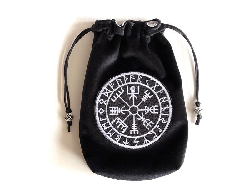 Мішечок з аплікацією-вишивкою "шолом жаху" Виготовлений з щільного чорного оксамиту, підкладка із сатину, затягується атласним шнуром із металевими намистинами. Мішечок стане зручним та оригінальним місцем для зберігання ваших карт, рун чи кристалів. Мішечок розрахований для стандартних колод карт Таро. Розмір мішечка: 9 см x 4 см (ширина дна) х 17 см або 13см х 17см повний розмір