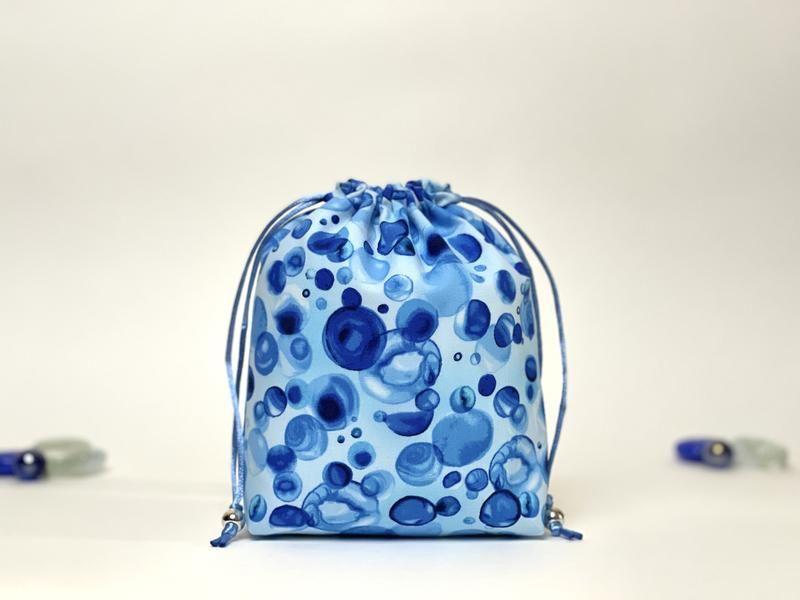 Еко мішечок виготовлений з американської преміум бавовни з принтом бульбашок води, внутрішня підкладка – сатин світло-блакитного кольору. Мішечок можна використовувати для подарунка, для зберігання прикрас чи особистих речей. Розмір мішечка: 12х4х16см (до шнурівки), повний розмір 16х17см.