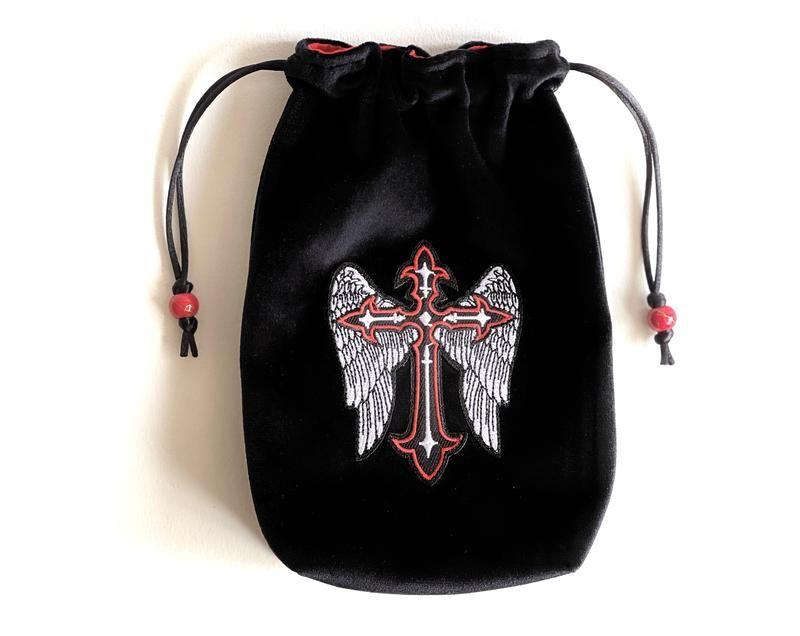 Бархатный мешочек с аппликацией-вышивкой креста с крыльями. Мешочек изготовлен из плотного бархата черного цвета, подкладка из сатина, затягивается атласным шнуром с бусинами. Мешочек рассчитан для стандартных колодов карт Таро. Размер мешочка: 9 см x 4 см (ширина дна) х 17 см или 13см х 17см полный размер
