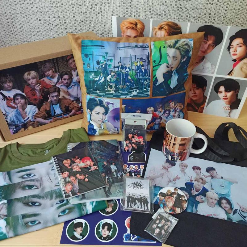 Бокс подарунковий Stray Kids , що входить: - коробка - подушка - футболка - чашка - ломо карти - сумка шопер - скетчбук - блокнот - стікерпак - постер - магніт - значок 7,5 см - брелок