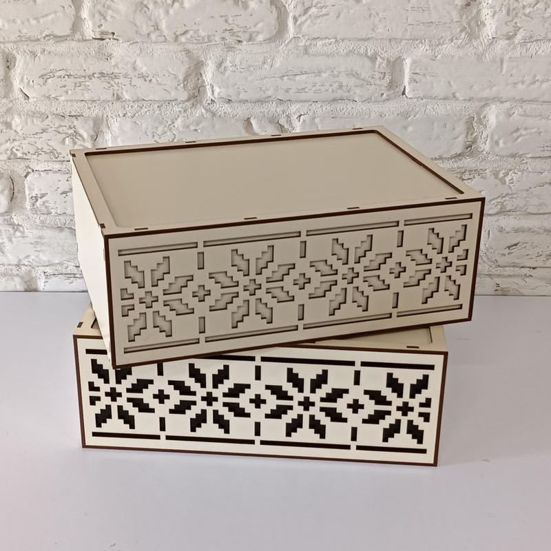 Подарочная коробка или коробка для презентации товара. Изготовлено из ХДФ кремового оттенка. Внешний размер: - длина 29см - ширина 20 см - высота 10 см Дизайн коробки выполнен в удобном формате, крышка надежно фиксирует содержимое. Двойные стенки не только позволяют укрепить конструкцию, но и делают рисунок еще более объемным. При необходимости нанесем логотип, приветствие, рисунок. Стоимость услуги гравировки рассчитывается индивидуально. Изготовление коробок по индивидуальным размерам, в нужных цветах с нанесением информации или логотипов.