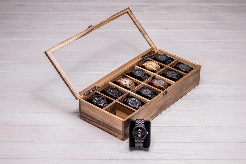 EB-(2-6).1 Коробочка для часов со стеклянной крышкой 4/6/8/10/12 Представляем Вам серию коробочек-органайзеров для часов на ремешках. Высококачественное производство мастеров столярного дела, применение только натуральных материалов - древесины, стекла и масел, и качественная металлическая фурнитура делают наш органайзер для часов ценным и стоящим подарком для любого человека, кому важен комфорт и порядок в личном пространстве. В комплекте с органайзером для часов идет соответствующее количество подушечек из очень мягкой ткани черного, синего, красного или зеленого (на выбор) цветов, потому процесс укладывания часов назад в органайзер крайне приятный. Размер ячейки - 60х80х65 мм, чего более чем достаточно даже даже громоздких часов. Стандартные позиции рассчитаны на 4, 6, 8, 10 и 12 предметов. В нашем ассортименте есть версия коробочки со стеклянной (как тут) или деревянной крышкой (на Ваше усмотрение). Также есть версия этого изделия с дополнительной шухлядой внизу. Размер органайзера для часов в зависимости от количества ячеек: 4 - 180x141x82 мм; 6 - 208x180x82 мм; 8 - 275x180x82 мм; 10 - 342x180x82 мм; 12 - 409x180x82 мм. Изделие продается в аккуратной картонной коробке, пригодной для вторичной переработки. По желанию клиента мы можем выгравировать Ваши инициалы, любимую цитату или логотип компании в любом месте на нашем продукте (и на дереве, и на стекле) или даже изменить его конструкцию по Вашему запросу. Кроме этого, мы обернем Ваш заказ в подарочную упаковку или вложим поздравительную открытку с Вашим сообщением, если Вы нас об этом попросите. Обратите внимание: цвет Вашего продукта может незначительно отличаться от изображения, поскольку каждое изделие имеет индивидуальные и уникальные характеристики и особенности древесины. Ежедневно отправляем заказы Укрпочтой (бесплатно от 1000 грн) или Новой Почтой (бесплатно от 2000 грн). Материал: высококачественная обработанная древесина грецкого ореха, пропитанная натуральным маслом. Сделано в Украине по всем стандартам eco-продукции.