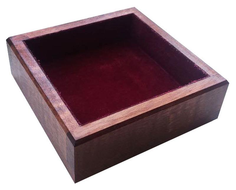 Лакированная деревянная коробка, внутри оклеена оксамитом. Прекрасно подходит для декора на праздники, для подарков, декора кольцо, всяких безделушек, и проч. Материал дерево (Явор - твердая порода, цвет - Красное дерево (Темно красный)) Внутренний размер 10 см./10 см. высота 2,5 см.