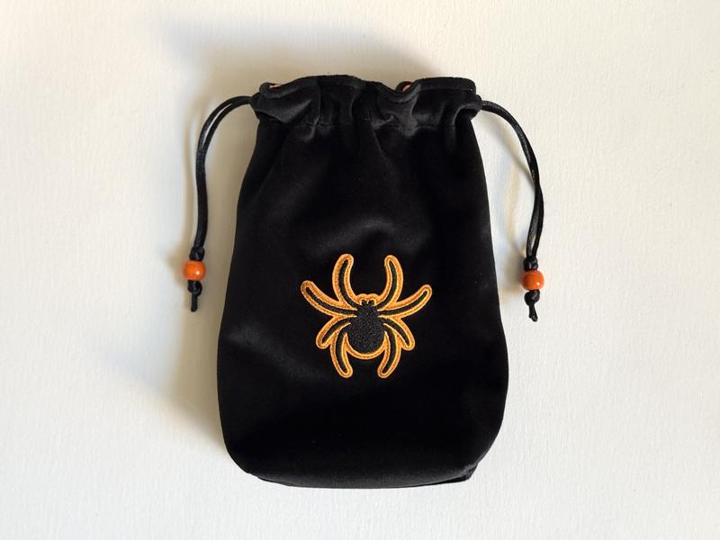 Мішечок з аплікацією-вишивкою павучка Виготовлений з щільного чорного оксамиту, підкладка із сатину, затягується атласним шнуром з намистинами. Мішечок стане зручним та оригінальним місцем для зберігання ваших карт, рун чи кристалів. Розрахований для стандартних колод карт Таро. Розмір мішечка: 9 см x 4 см (ширина дна) х 17 см або 13см х 17см повний розмір