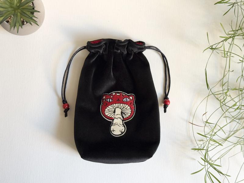 Мішечок з аплікацією-вишивкою грибочка. Виготовлений з щільного чорного оксамиту, підкладка із сатину, затягується атласним шнуром з намистинами. Мішечок стане зручним та оригінальним місцем для зберігання ваших карт, рун чи кристалів. Розрахований для стандартних колод карт Таро. Розмір мішечка: 9 см x 4 см (ширина дна) х 17 см або 13см х 17см повний розмір