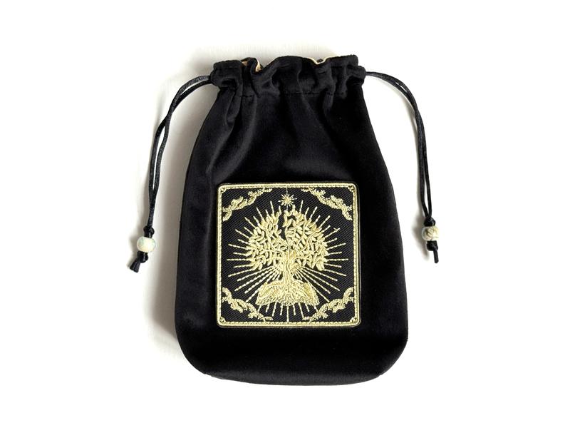 Мішечок із аплікацією-вишивкою дерева. Виготовлений зі щільного чорного оксамиту, всередині — сатинова підкладка, затягується атласним шнуром з намистинами. Ідеально підходить для зберігання карт Таро (стандартного розміру), рун, кристалів, амулетів або прикрас. Розмір: 9 см х 4 см (ширина дна) х 17 см або 13 см х 17 см (повний розмір). Цей мішечок не просто зберігає речі - він оберігає те, що для вас важливе.