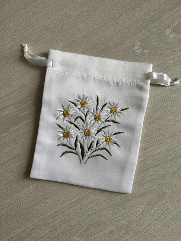 Мішечок на завʼязках, прикрашений вишивкою із зображенням едельвейсів. Має завʼязки з білої стрічки для закриття. Використовується для зберігання дрібних предметів та сувенірів Ширина 15 Довжина 20 Ціна 135 грн