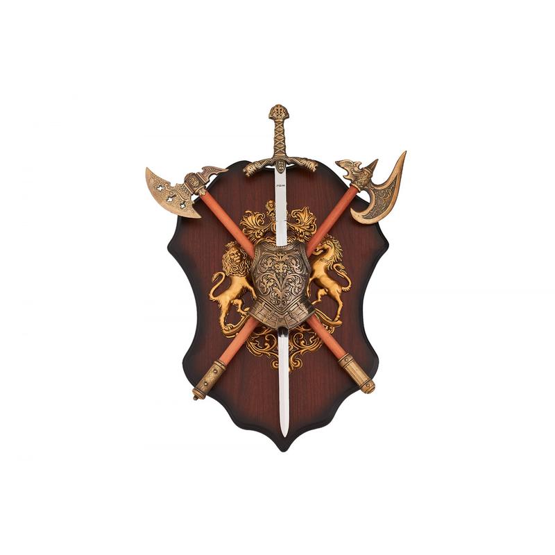 Панно сувенирное - настенное украшение в средневековом стиле Средневековая тематика никогда не устареет. Потому сувениры и подарки, украшения и декор в рыцарском стиле пользуются неувядающей популярностью. Сувенирное панно отлично подойдёт в качестве настенного украшения кафе, личных кабинетов, библиотек и даже детских. Его с успехом можно использовать, как один из элементов декора интерьера в средневековом стиле, так и просто "в одиночку". Панно состоит из деревянного щита с геральдическим узором, поверх которого закреплены качественные изображения рыцарской кирасы, скрещенных боевых секир и рыцарского меча, украшенного изображениями львов и гербом Ричарда Львиное сердце. Все элементы рыцарской экипировки детализированы и выполнены со вкусом. Клинок меча изготовлен из полированной нержавеющей стали марки 420. При этом лезвия моделей не заточены и совершенно безопасны! Характеристики: - ДЛИНА КЛИНКА, ММ: 325 - МАТЕРИАЛ ЧЕХЛА: ДЕРЕВО, МЕТАЛЛ - ПОВЕРХНОСТЬ КЛИНКА: MIRROR POLISH - ТВЕРДОСТЬ СТАЛИ, HRC: 50-52HRC - МАТЕРИАЛ ПОДСТАВКИ: МДФ - ШИРИНА КЛИНКА, ММ: 15 - ТОЛЩИНА КЛИНКА, ММ: 2.8 - МАССА, Г: 1270 - МАТЕРИАЛ УПАКОВКИ: КАРТОН - КОМПЛЕКТАЦИЯ: ДЕКОРАТИВНОЕ ПАННО, СТЕННОЙ КРЕПЕЖ - ДОПОЛНИТЕЛЬНАЯ ИНФОРМАЦИЯ: РАЗМЕР ПАННО 370*280 ММ Остальные товары здесь.