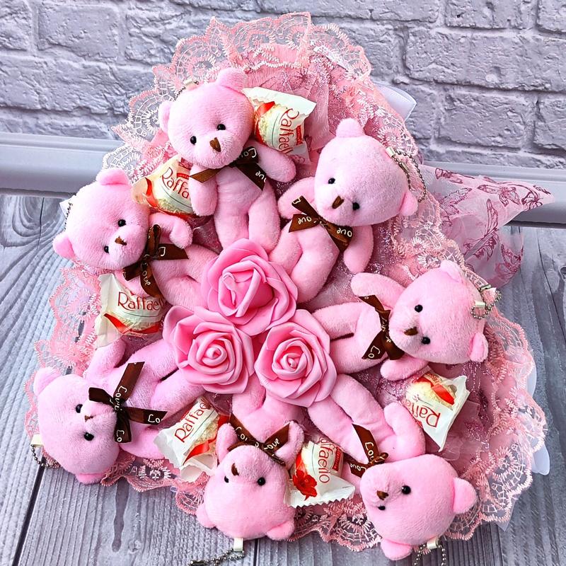 Розовый букет из мягких игрушек и конфет в форме сердца, необычный подарок ребенку девушке...