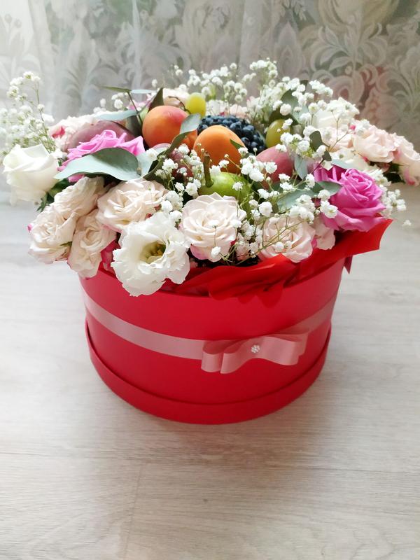 Подарочная коробочка с цветами и фруктами,варианты могут быть разными.