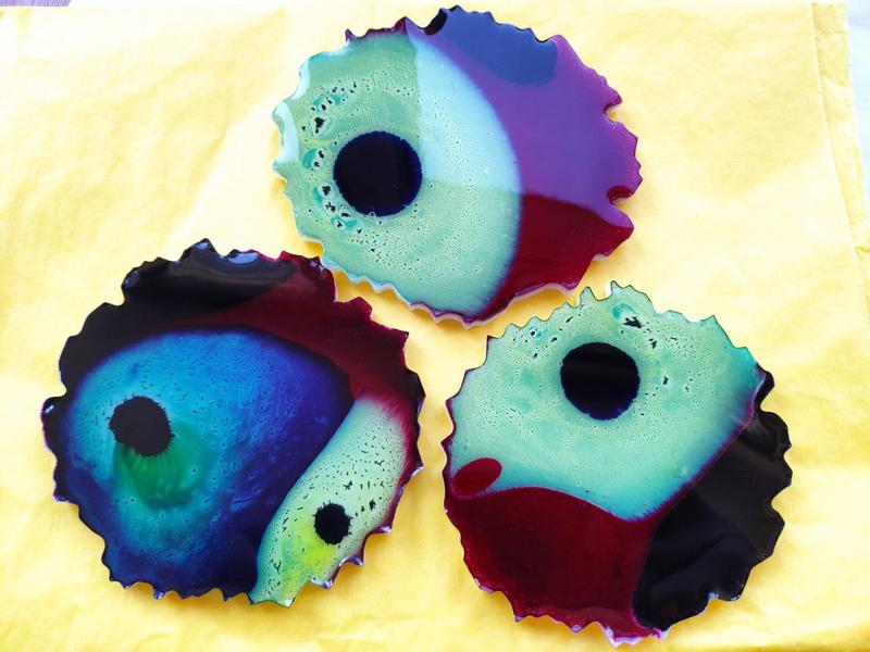 Неповторний та ексклюзивний виріб з епоксидної смоли. Можна використовувати для святкового та щоденного сервірування столу. .Прекрасно підійде як в особистому використанні, так і як подарунок любителям незвичайного та оригінального! Термостійке покриття! Ручна робота! Діаметр – 9.5см! Подарункова упаковка! Вартість вказана за набір із 3шт!