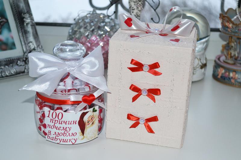 Декорированная баночка - 100 причин любви. Отличный подарок для вашей любимой бабушки! Этот подарок не просто удивит, но и запомнится на долго! В баночке содержится 100 свитков на каждом из которых написана 1 причина любви. Баночка идет в комплекте с коробочкой!