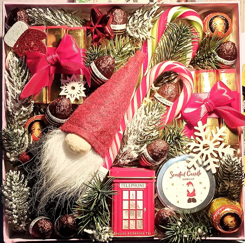 В наличии. Новогодний бокс. Наполнение: - подарочная коробка с открыткой - декор - игрушка гном скандинавский - английский черный чай - ароматизированная свеча с ароматом ванили - конфеты Моцарт 2 вида - конфеты Ферреро Роше новогодние шишки - карамель новогодняя трость 2 вида Под заказом возможно любое наполнение на любой вкус и бюджет.