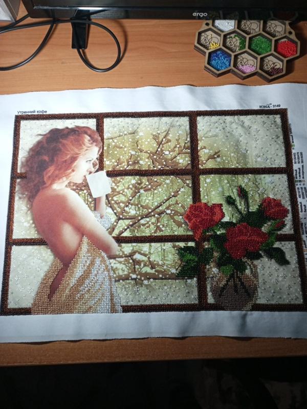 Картина "Уранний кофе", с имитацией падающих снежинок. Почти восемь тысяч бисеринок. Размер зашивки 38*27. Можно вышить ваш заказ, цена по договору.