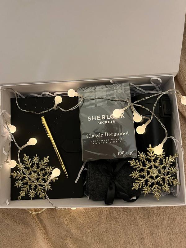 Наполнение:- Качественная,тверда коробка,белого цвета. Термос, выдержит температуру 3-5 часов,черного цвета. Термо- носки (качественный, мягкий материал)темно-серого цвета. Чай "Sherlok",черный с ароматом Бергамота и лимона. Блокнот для записей,черного цвета. Ручка металлическая, золотистого цвета. Новогодние украшения на елку, (снежинки) золотистого цвета.