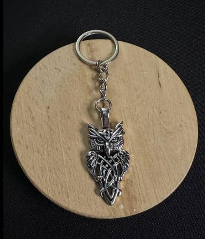Брелок оберег Сова Описание: - Материал: ювелирный сплав - Цвет: серебристый - Размеры: 48 мм* 24 мм*3мм - Длина цепочки с карабином и кольцом 6, 5 см