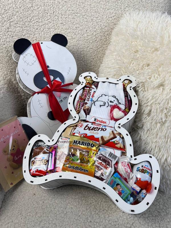 Ведмедик Размеры: 330/310/90 У box входить: 🐻Дервездная коробочка в виде мишки 🐻Открытка 🐻Тематические носки 🐻Haribo (желейки в форме мишки) 🐻Haribo (желейки рулет) 🐻Love candy (tiktak) 🐻Ferrero Rocher - 2 шт 🐻Леденец «I love you” 🐻twix - 2 шт 🐻Kinder chocolate - 3 шт 🐻kinder Choco-bons 🐻Kinder bueno палочка 🐻Kinder bueno 🐻Kinder surprise 🐻Nutella mini 🐻Rafaello 🐻Love is 🐻Kinder country 🐻Kinder cards 🐻PowerGum - 2 шт Цена: 910 При заказе от 2х единиц, доставка бесплатна) Для заказа пишите в личные / позвоните