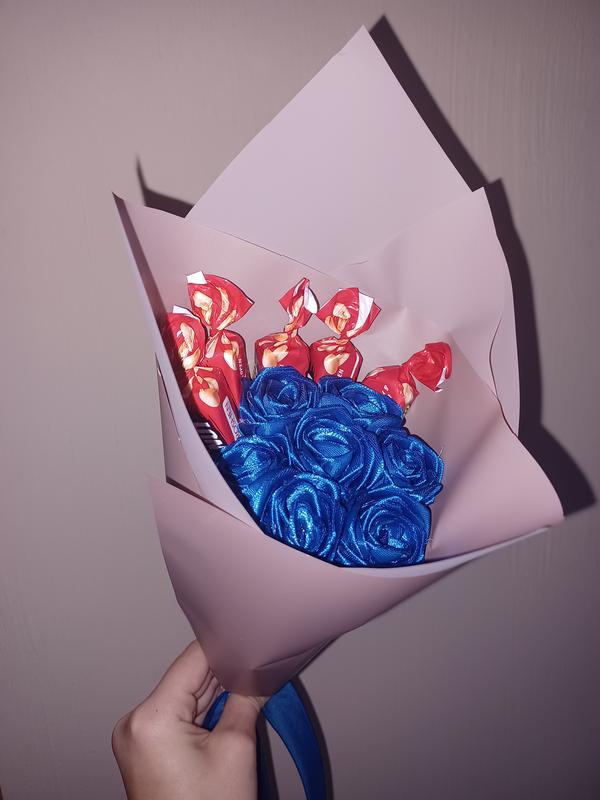 Букетик роз из атласных лент. В данной букете 7 розочек и 5 конфет. Для заказа писать заранее!