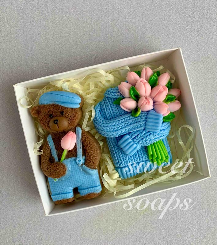 Під замовлення! Термін виконання 1-2 дні. Такой трогательный набор мыла в виде медведя с тюльпаном и целый охранник цветов в свитере! Подарите яркие впечатления и яркие эмоци! Размер: 15/10 см. Вес: 150 гр.
