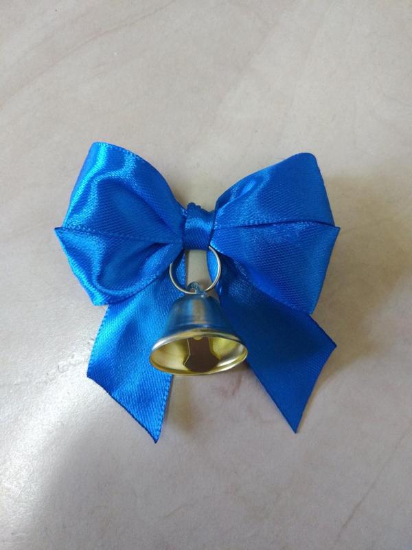 Колокольчик металлический "золотой" с бантом из синей атласной ленты для праздника первого и последнего звонка в школе.