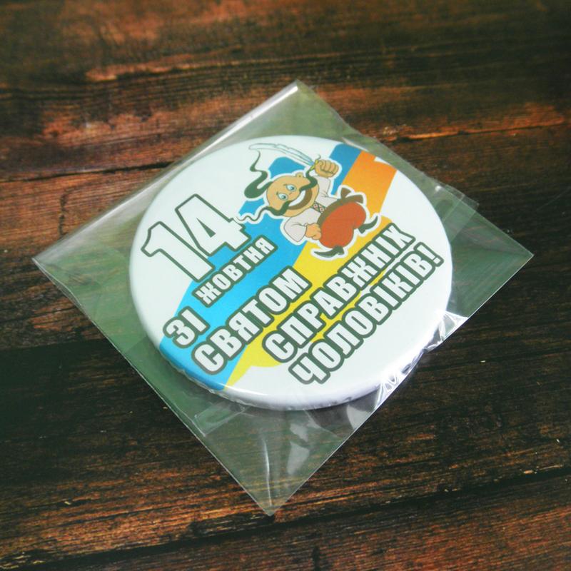 Магнит на холодильник закатной с бутылкооткрывателем в подарок - "1 жовтня - Зі святом Справжніх Чоловіків". Размер магнита - 56 мм в диаметре.