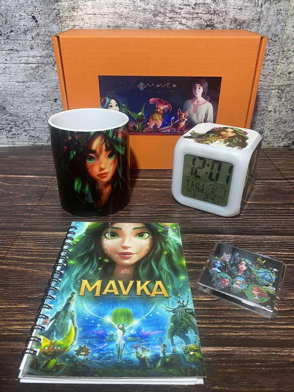 В набор Мавка входит: 1) Часы будильник хамелеон размер 8/8/8 см Очень эффектная и нужна вещь! Меняет цвет, отлично смотрится в темное время. Термометр покажет температуру в комнате, а будильник позволит не опоздать на занятия и встречу с друзьями. 2) Чашка, премиум керамика глянцевая поверхность и качественный рисунок. Объем чашки 330 мл, высота 9,5 см. 3) Блокнот для рисования формат А6 40 белых листов, картинка спереди из заду. 4) Магнит с любимыми персонажами 7*7см. 5) Коробка оранжевого цвета 24/17 см с подарочным наполнением. Если возникнут вопросы воспользуйтесь чатом мы с радостью ответим Вам.